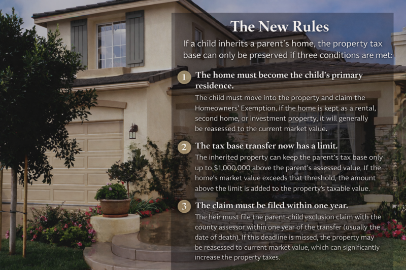 For decades under Proposition 58, children could inherit property and keep the parent’s low property tax base—even if the home became a rental or second home. Proposition 19 narrowed those rules considerably.