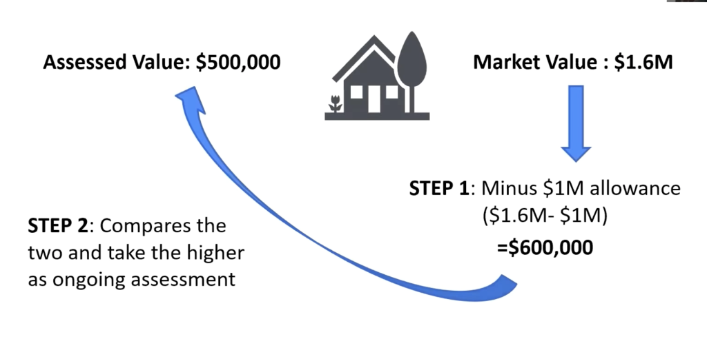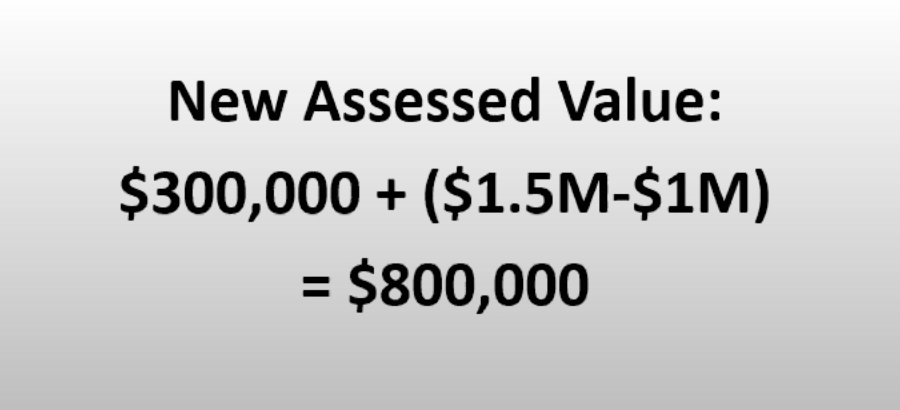 The new taxable basis will be the assessed value of the property at the time of transfer minus $1M.